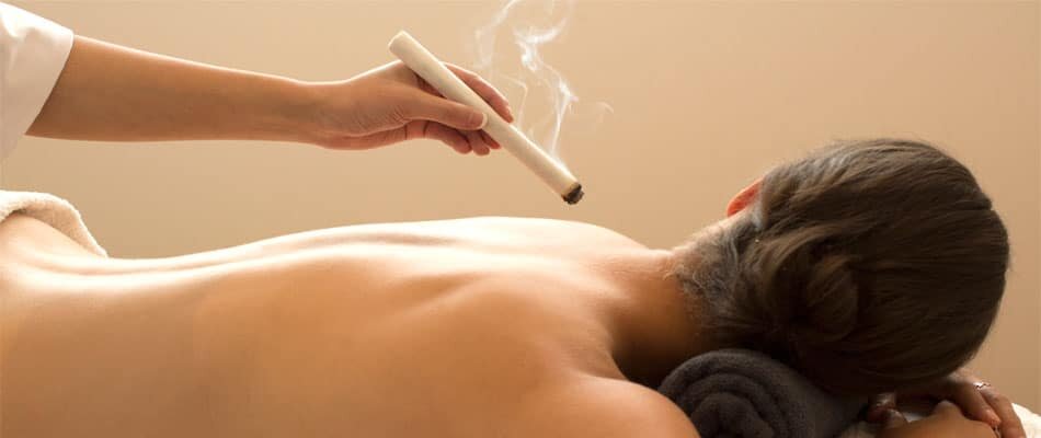 Aplicación de calor en puntos de acupuntura usando cigarros de artemisa o de forma general mediante lámpara infrarroja